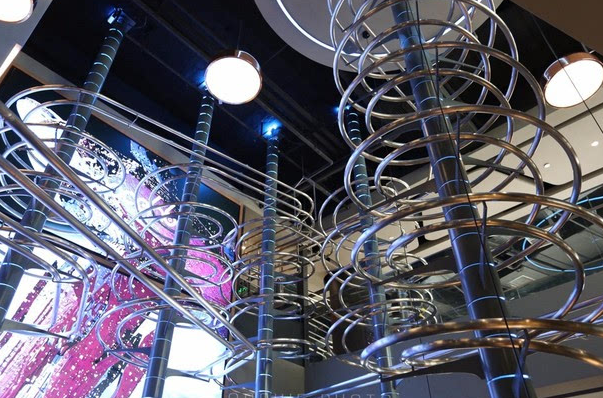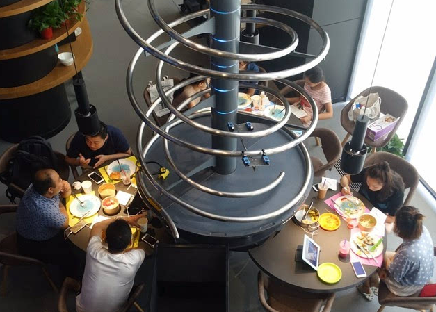 由于通过轨道传输的都是快餐类型,所以最慢9分钟也能做好了。菜品做好,它们顺着螺旋轨道“嗖嗖嗖”传送,只需要用17秒!