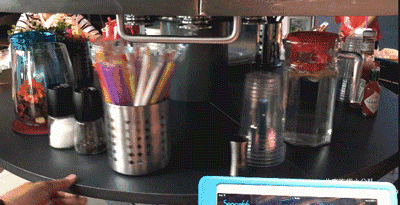 下层转盘放了一些用餐时会用到的餐具、调味料,也是自己取用的。