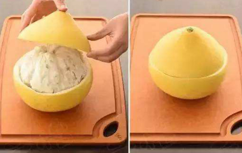 tips:这个步骤可以看成是给柚子“脱外套”,千万不要弄破了柚子的“外衣”,吃不掉剩下的柚子就可以放回我们留下的柚子的“外衣”和“帽子”里,一个天然的微型“保鲜柜”就这样做好了。由于柚子皮厚且富含水分,所以蒸发时会先蒸发自身的水分从而保持内容物的水分,当然这个可以保持水分的“保鲜柜”里不只可以放柚子,其他一时吃不掉的水果、糕点也可以放。