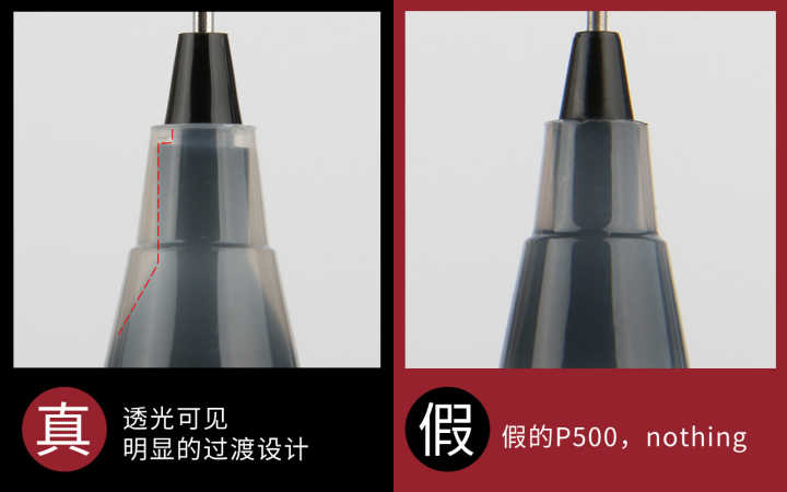 正品的三点承托凹槽明显比仿品更深,这样的设计使得滚珠更加稳定,减少磨损提高笔尖寿命,这也是P500书写长度能超过1500米的原因。