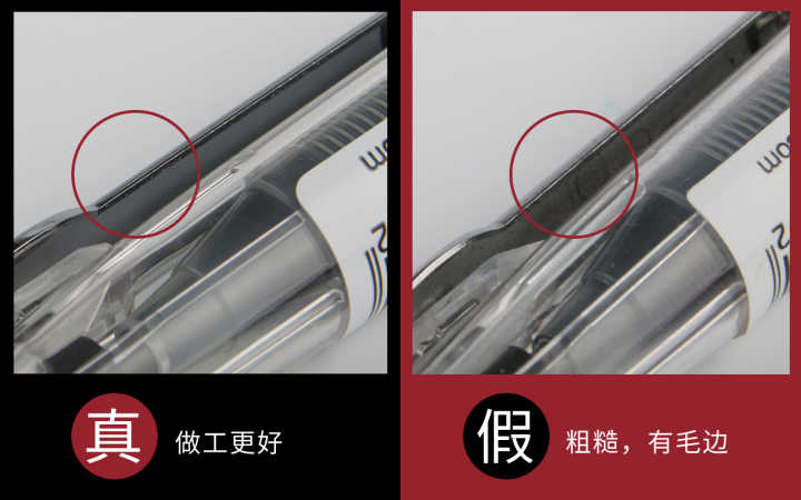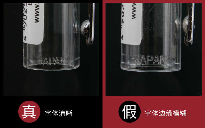 在笔帽的末端的阳刻“japan”字体上,仿品的边缘可谓是糊的不忍直视。而正品干净利落,清晰可见,绝不拖泥带水。