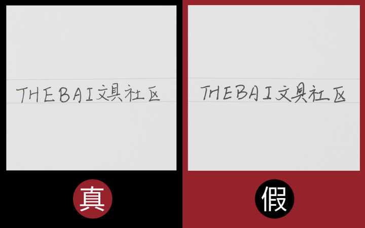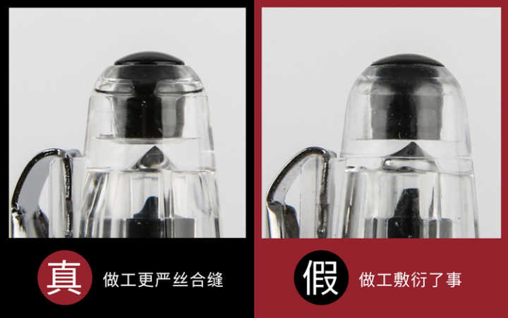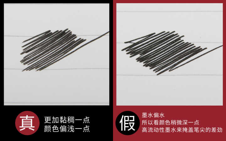 正品出墨稳定性更好,而仿品则利用墨水流动性强的特性掩盖了它笔尖的不足,如果手头没有一支正品作为对比,较难分辨真假。所以单从写感判断真假是完全不现实的,请勿以主观写感判断真假货。