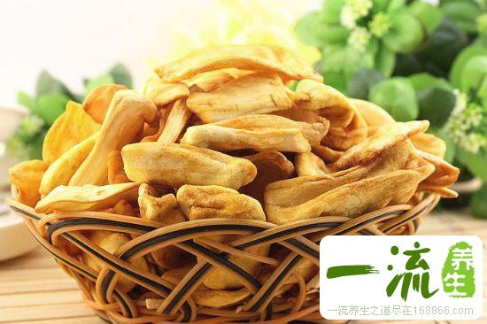 菠萝蜜干炒熟食用,味美如栗,有止渴、通乳、补中益气功效,中含有丰富的糖类、蛋白质、B1、B2、B6、维生素C、矿物质、脂肪油等,服用菠萝蜜干后能加强体内纤维蛋白的水解作用,可将阻塞于组织与血管内的纤维蛋白及血凝块溶解,从而改善局部血液、体液循环,使炎症和水肿吸收、消退,对脑血栓及其它血栓所引起的疾病有一定的辅助治疗作用。