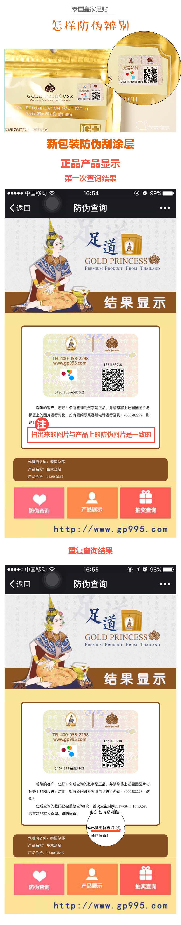 第一,我们都知道足贴每一袋背后都会有防伪码,最下面都有独立的编码。一箱足贴有100袋,每个箱子的前5位流水码都是不一样的,而后3位的流水码是001-100,刚好把100袋平分完。大家收到货后先看看后面的数字对不对。还有一点,现在背后的二维码已经换新版本了哦