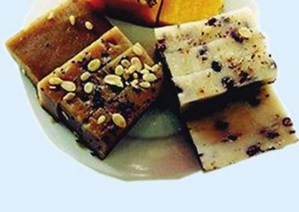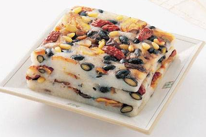 原料:糯米粉1.5千克、粳米粉1千克、砂糖0.5千克、红米、绿叶、黄珠、酱色等色素,绿红色蜜饯丝,炒熟芝林少许。