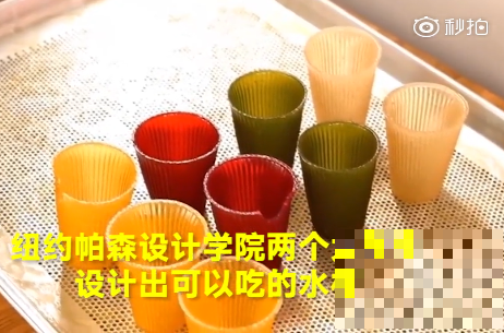 纽约帕森设计学院两个大学生设计出可以吃的水杯。解决了一次性塑料杯对环境污染的危害。以琼脂代替塑料不仅可以食用,还能配合一些调味香料做出不同颜色和口味。琼脂成分能为植物提供丰富的营养,所以杯子丢在泥土中很快会被降解。不会对环境造成危害。