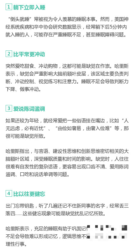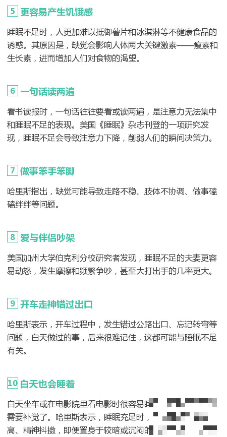 ①躺下立即入睡;②比平常更冲动;③爱说陈词滥调;④比以往更健忘;⑤更容易产生饥饿感;⑥一句话读两遍;⑦做事笨手笨脚;⑧爱和伴侣吵架;⑨开车走神错过出口;⑩白天也会睡着。