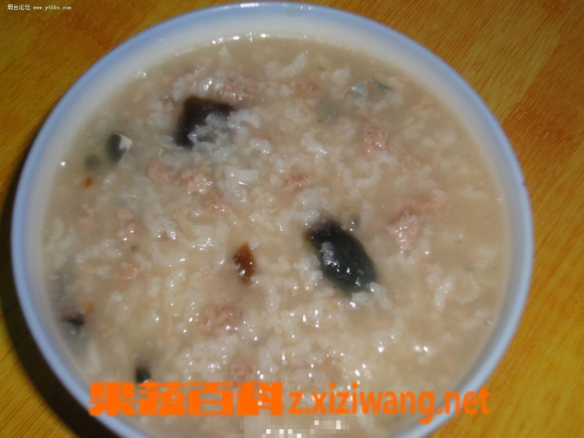 材料与做法:皮蛋2只,切成粒;瘦肉切成薄片,先放入少量食粉、盐捞匀至起胶,再放入少许水,捞匀,然后放入少许生粉,捞匀后再放入少许水,如是者令肉片完全吸收了水分,体积膨胀了1/3—1/2后,加入生油、姜丝等捞匀,腌4小时,待用;将煲好的粥底滚开,先放入姜丝、皮蛋粒,滚开后,放入肉片,待肉片浮起九成熟时离火,撒上芫茜、葱花,滴上数滴麻油即可。