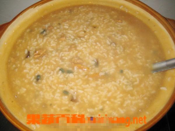 1.用七两米(四两糯米,三两白米)淘净,放水浸泡一小时,放沙锅煮至米粒烂.(大火开后小火煮粥,这样的沙锅粥非常香,好吃.因为是沙锅容易粘锅底,所以要常常搅动,用高压锅就不用搅动)。