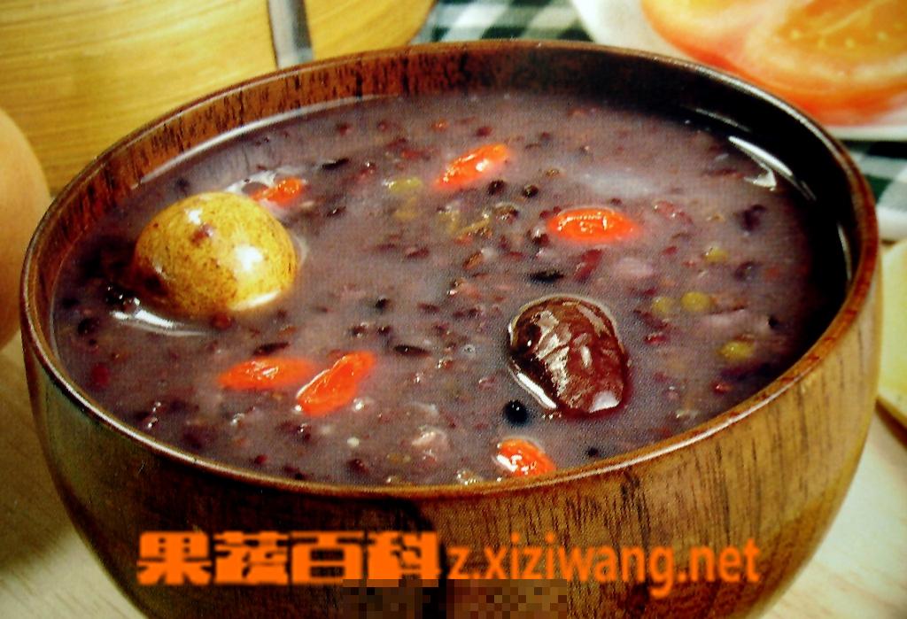 大米1杯、燕麦米1杯、薏米1/2杯、紫糯米1/2杯、红豆1/4杯、绿豆1/4杯、黑豆1/4杯、芡实1/4杯、莲子15颗、花生20颗、枸杞20颗、黑芝麻1/4杯。