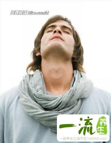 第3节:脖子向前探,并努力使下巴靠近胸部,然后将头大幅度后仰,连续做2至6次。