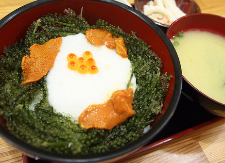 不过在日本,还是有热食的海葡萄的美食,乌冬面煮好,配上龙须菜、裙带菜和高汤之后,再用海葡萄点缀就可以了。
