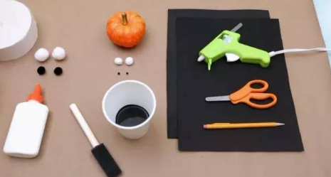 准备材料:棉花球、南瓜、黑色颜料、剪刀、黑色卡纸、胶水、纸巾