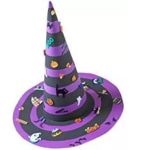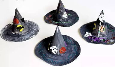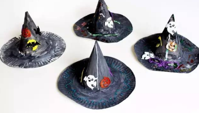 最后一步就是上色啦,还可以粘上一些南瓜、乌鸦、蝙蝠、 小鬼的贴纸哦,这样做出来的帽子更加好玩~