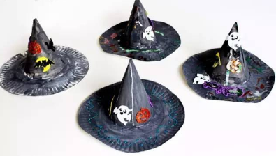 如果没有一次性纸盘,也可以用卡纸做帽檐哦, 用黑色卡纸装饰紫色帽子也是不错的选择~