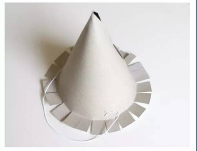 然后再折一下帽子的底部,让底部的条状卡纸向四周撒开,方便下一步的固定~