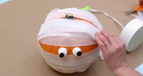 然后再用纸巾缠绕南瓜,眼睛部分要留出来哦,可爱又有一点恐怖的搞怪南瓜就完成啦~