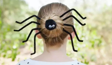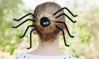 最后,将扭扭棒折成蜘蛛腿的形状,插在盘好的丸子头里,万圣节专属发型就完成啦~