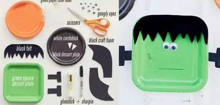 准备材料:方纸盘和圆纸盘、活动眼睛、 卡纸或海绵纸、胶水、彩笔、剪刀。 制作步骤: