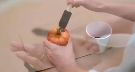 将小南瓜涂上黑色颜料,记得带上手套哦~