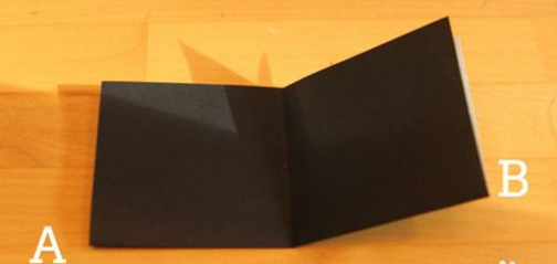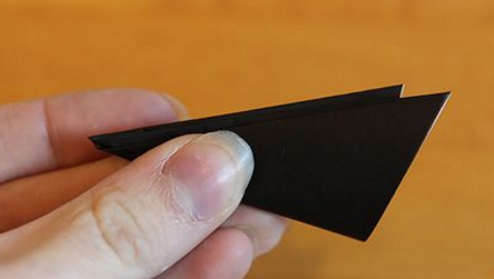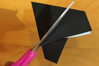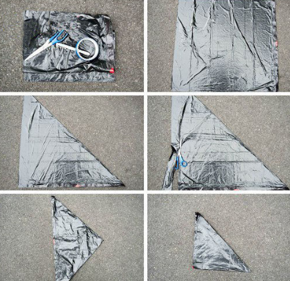 首先将一个黑色的大塑料袋剪开,变成正方形,将起对折成三角形后,如果有多余的部分,请剪掉,然后再对折两次,如下图