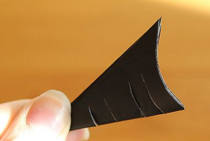 将三角形的开口一侧向封口的一侧折叠,用记号笔在上面进行如图标记,然后按照标记好的条纹裁剪,注意有些地方不要裁开剪断,最后得到如图5,将其展开