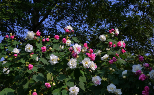 芙蓉花是在晚秋季节开的,颜色和樱花一样的淡雅美丽,因而有诗说其是“千林扫作一番黄,只有芙蓉独自芳”。芙蓉花花期长,开花旺盛,品种多,其花色、花型随品种不同有丰富变化,是一种很好的观花树种。