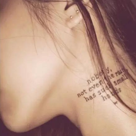 这算是纹身所有位置里最显眼的,所以纹在这块的图案和语句要格外慎重,一些柔美的线条和古典花纹会比较合适。
