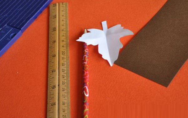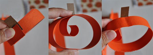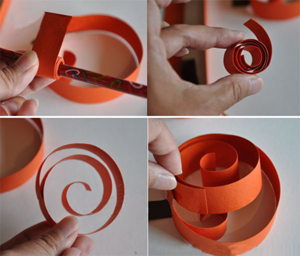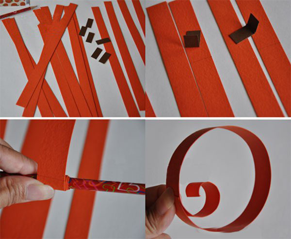 首先准备好所需材料,将橘色彩纸裁剪成长条,棕色卡纸裁剪成小长条,如图,将一根长条卷在铅笔上,然后松开后绕成圈固定住,注意要留出一小截卷曲的部分在内侧,如图