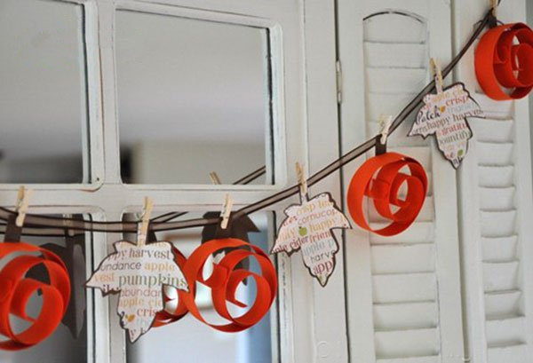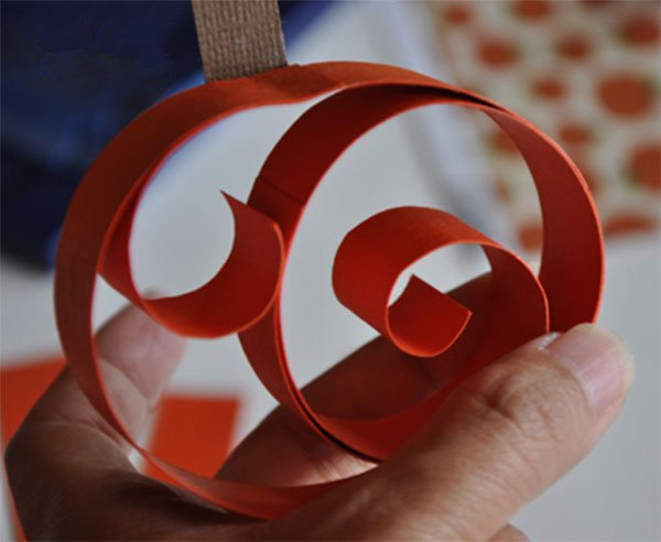 将两个卷曲的圆圈整理一下,如图,另外在彩纸上裁剪一些树叶的形状,如果想要有趣一点,可以在树叶上写一些字谜,装饰在合适的地方,万圣节的时候一起猜谜语吧~