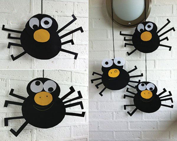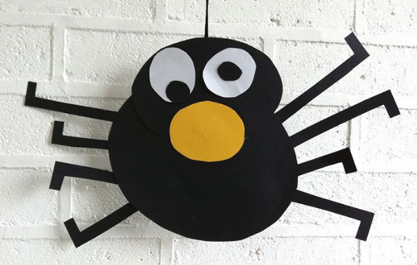 将之前准备好的卡纸组合粘贴固定起来,形成一个小蜘蛛,蜘蛛的拼贴方法可以多样,脚可以有长有短,这样会显得更可爱有趣哦!