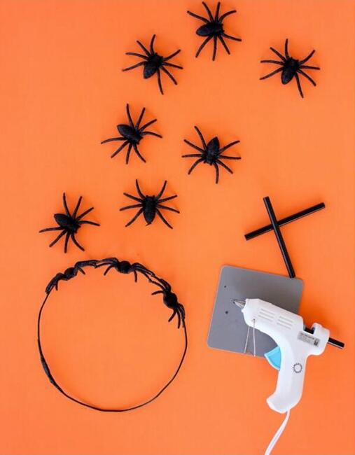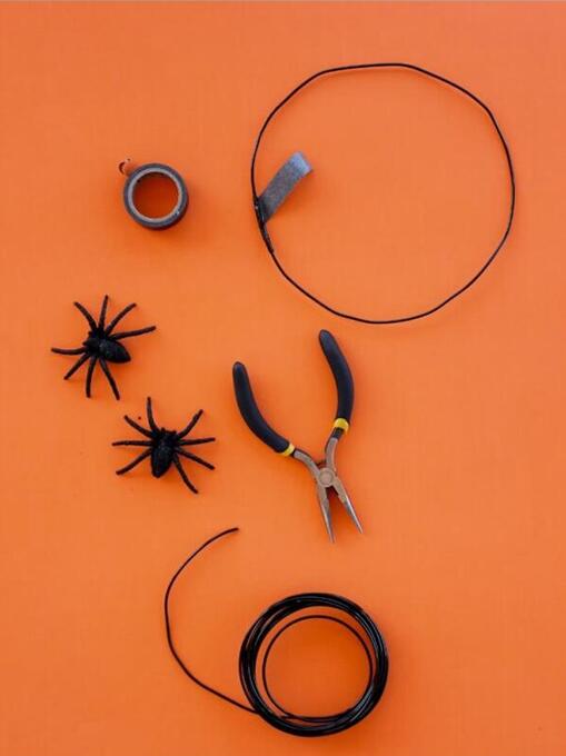 材料:黑色铁丝或塑料线,剪线钳,大号塑料蜘蛛模型玩具,热胶枪,黑色胶棒,黑色胶带。