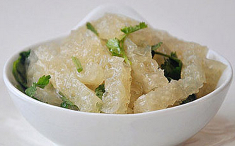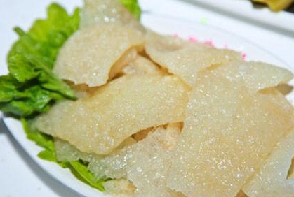 1、猪肉皮要选用粗壮膘肥的猪,而且必须仔细剔净肉皮上残留的肥膘,再用清水煮至肉皮呈半透明状。