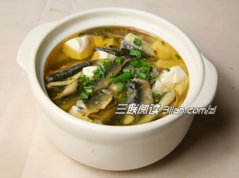 4、原锅中留少许油,下葱花、生姜末煸香,放入豆腐、泥鳅,喷酒,加鲜汤,滚烧至豆腐起孔