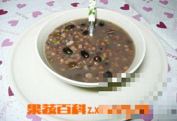 美肤杂粮粥,原料:黑豆14g,黑米14g,小米34g,绿豆34g,红豆34g,薏仁34g,糙米34g,芡实34g