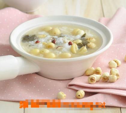 食谱营养莲子:莲子含有丰富的蛋白质、碳水化合物、烟酸、钾、钙、镁等营养元素,具有防癌抗癌、降血压、强心安神、滋养补虚、止遗涩精等功效。芡实米:芡实含有丰富的淀粉,可为人体提供热能,并含有多种维生素和碳物质,保证体内营养所需成分;具有固肾涩精,补脾止泄,利湿健中之功效。糯米:糯米含有蛋白质、脂肪、糖类、钙、磷、铁、维生素B1、维生索B2、烟酸及淀粉等,营养丰富,为温补强壮食品;具有补中益气,健脾养胃,止虚汗之功效,对脾胃虚寒,食欲不佳,腹胀腹泻有一定缓解作用;糯米有收涩作用,对尿频,盗汗有较好的食疗效果。