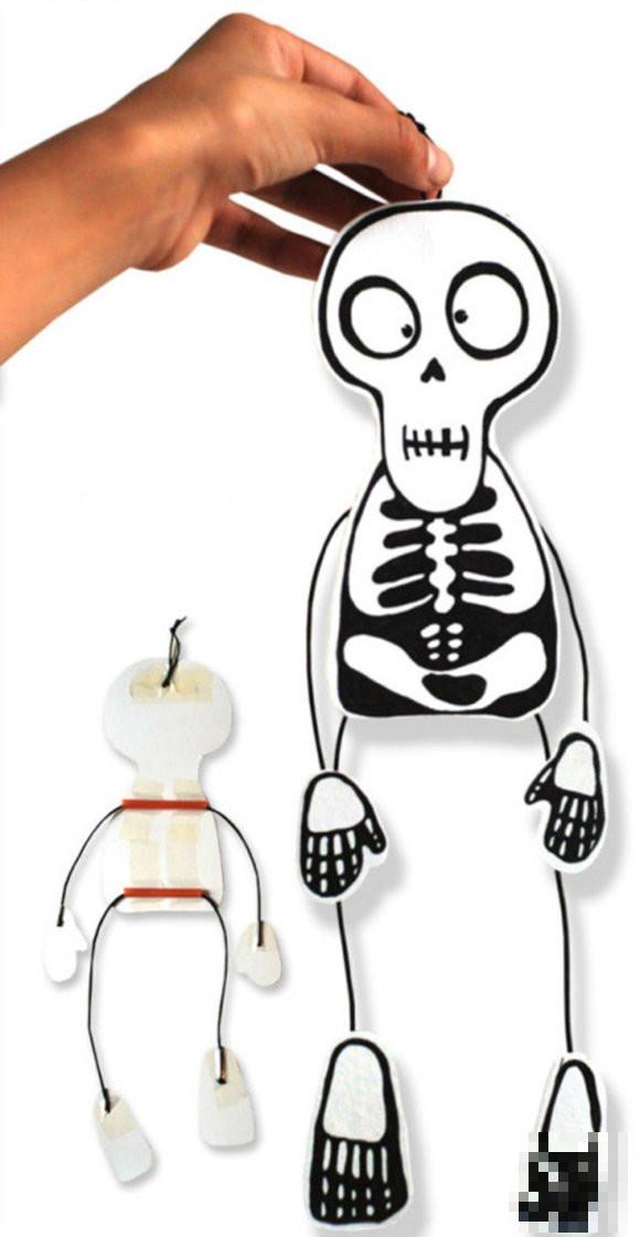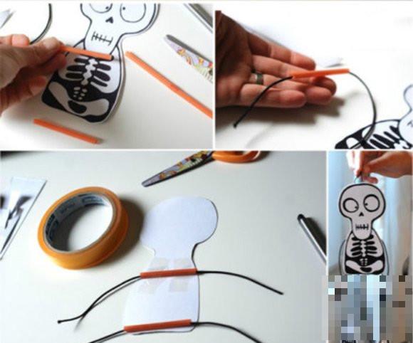 第四步:最后再在骷髅头部粘贴一根挂绳,一个手脚可以抽动、晃晃悠悠的“恐怖”骷髅小人就DIY制作完成啦!