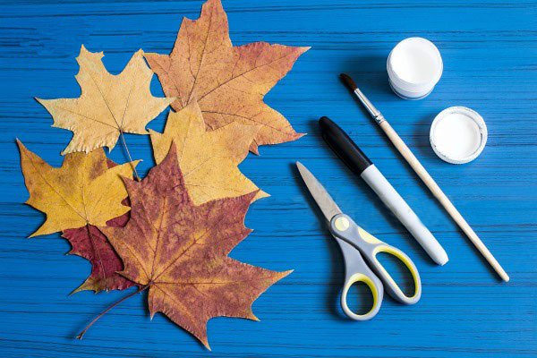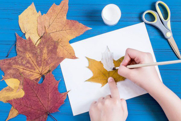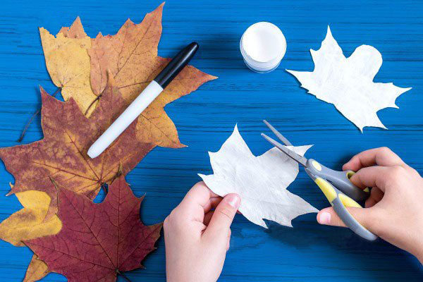 首先准备好一些秋天的树叶,剪刀,记号笔,刷子和颜料,将树叶放在一张卡纸上,用手固定杆子,为其叶子表面刷上白色颜料