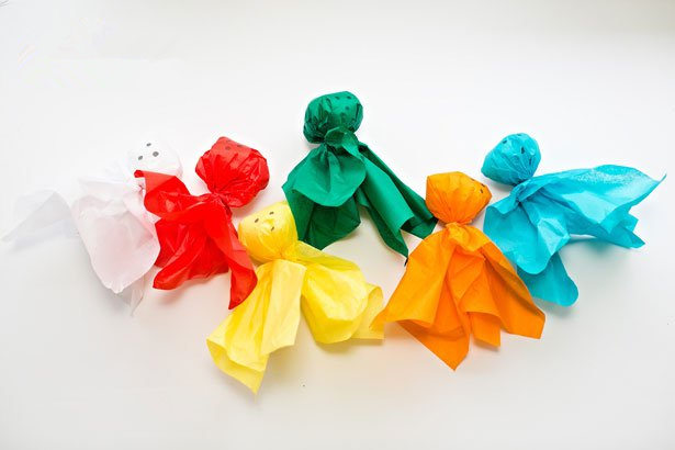 首先准备一些彩纸和废弃的报纸,将报纸揉成团,放在彩纸中间,用彩纸将报纸团包起来,用橡皮筋或者绳子扎起来,如图,记号笔画上眼睛和嘴巴