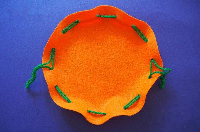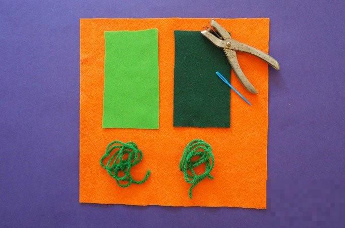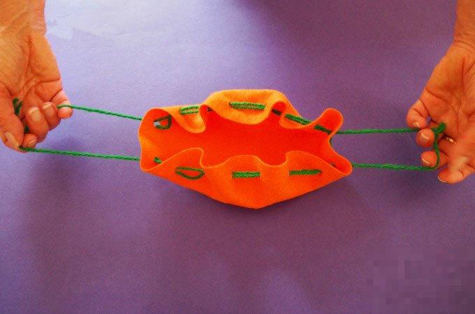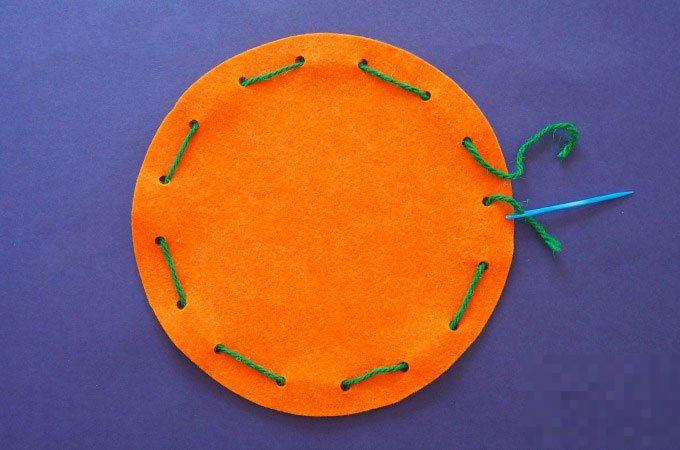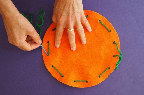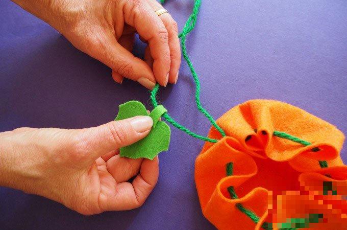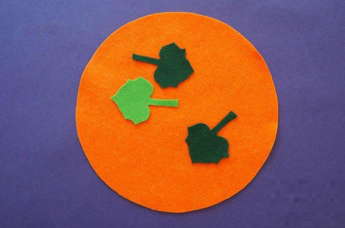 准备好两种颜色的绿色不织布,绿色毛线和一张大的橘色不织布,一根较粗的针和打孔机;将绿色不织布裁剪成南瓜叶子的形状,橘色不织布裁剪成大的圆形;将圆形的边缘打上孔并且穿上一根毛线,最后线的两头在一边汇合,如图