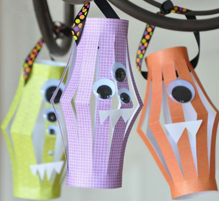 在白色卡纸上裁剪锯齿状的牙齿,粘贴固定在灯笼的合适位置,最后用彩带从灯笼的上方一侧穿过,就可以挂在自己喜欢的地方了~