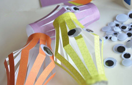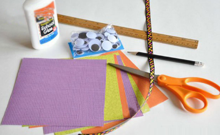 首先准备好一些彩纸,彩带,活动眼珠,胶水,剪刀等