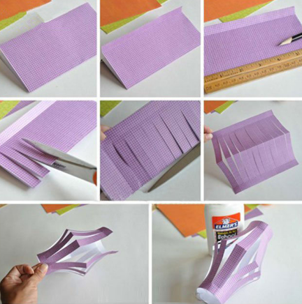 将展开后的彩纸卷成筒状,呈现灯笼的基本雏形,在上面粘贴活动眼珠