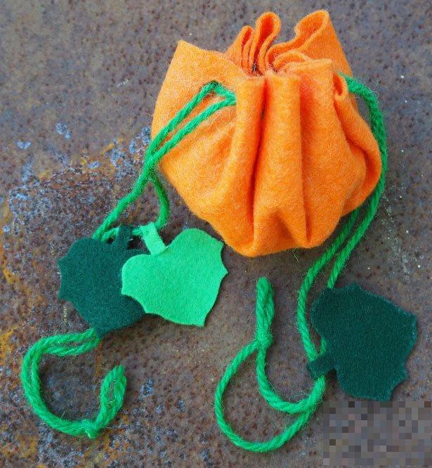 如果想要南瓜小包更好看一些,可以在绳子打结之前分别在两边穿上几片之前剪好的叶子,将叶柄部分弯过来固定成一个圈就可以了