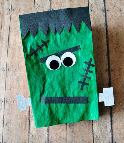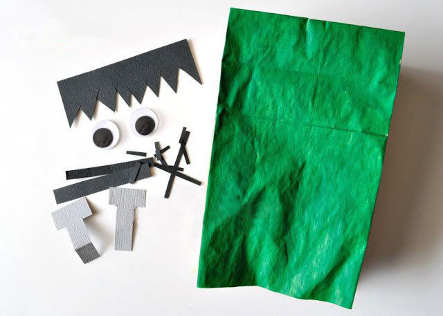 将剪下来的图案组合粘贴在合适的位置,最后在中间靠上的地方粘贴两个活动眼珠,整理一下就完成了,这个纸袋可以装饰,还可以装糖果当收纳袋呢!
