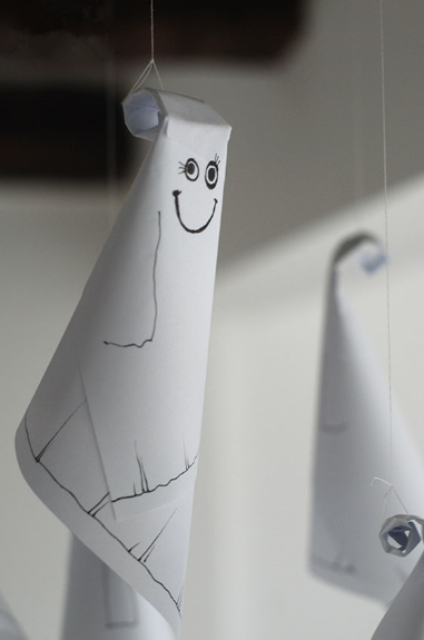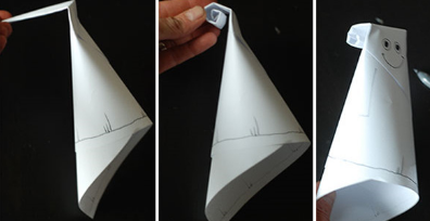 第四步:将卷好的纸筒尖的一边压扁,注意不要全压下来,然后把压扁的一边卷成卷,如图。并在上方添加上幽灵的眼睛和嘴巴。