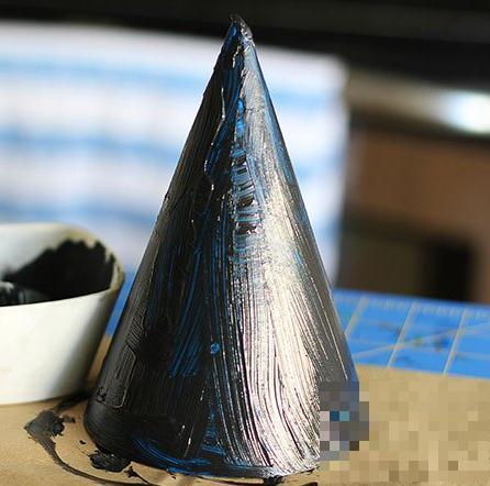 第一步:首先用卡纸卷成喇叭状固定好,然后将多余的纸减掉呈圆锥状,涂上准备好的黑色颜料,放在一边等待完全干掉。