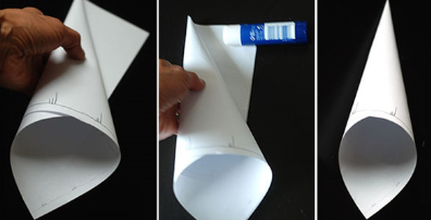 第三步:将白纸卷成喇叭状,注意有花纹的一边呈张口的状态,并用胶棒将其粘贴固定好。