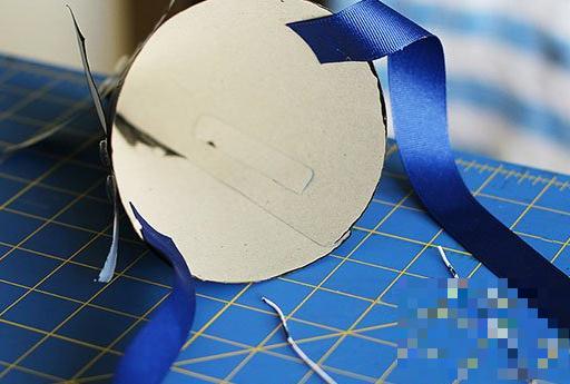 第六步:取出一截丝带,将丝带的两头贴在帽子的内侧。