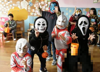 2、讨糖:游戏结束后,老师关门关灯,落窗帘,几位老师分散带着孩子藏起来,老师手拿糖果,藏好后让其他学生带上面具来讨糖,找出藏起来的小朋友并说上一句“trick or treat(不给就捣蛋),老师和孩子将糖分给讨糖的小朋友每一颗。